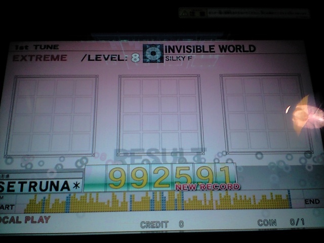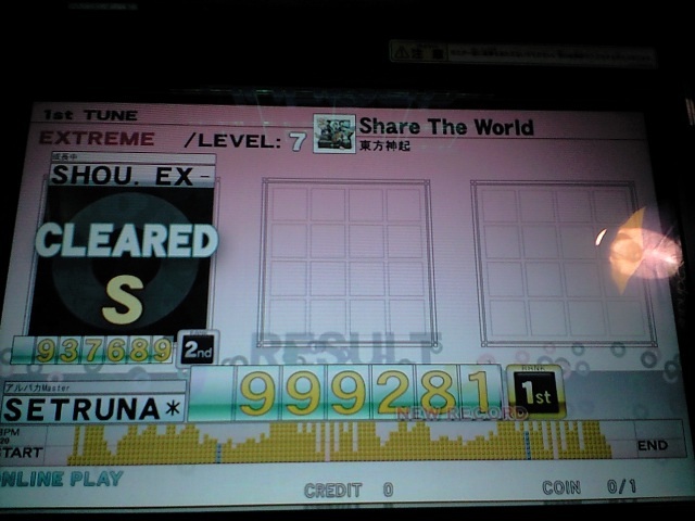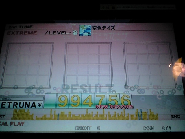 20100601のプレー記録 Total Best Score: 206181468 → 207200831 +1019363 Total Best Score順位: 18976 → 18843, ↑133 Grade Point: 1324408 → 1354171 +29763 Grade Point順位: 2683 → 2544, ↑139 プレー回数: 722 → 740 +18 プレー曲数: 2495 → 2567 +72 クリア回数: 2484 → 2555 +71 EXCELLENT回数: 43 → 48 +5 EXCELLENT曲数: 43 → 48 +5 FULL COMBO回数: 367 → 384 +17 FULL COMBO曲数: 136 → 138 +2 勝利ポイント: 1928 → 1939 +11 ADV平均: 228974 → 236608 +7634 ADV平均(プレイ済): 937365 → 939263 +1898 EXT平均: 993051 → 993199 +148 曲別データ あいのうた EXT BEST SCORE: 995728 → 1000000 +4272 EXT RATING: SSS → EXC EXT 初EXCELLENT! IN THE NAME OF LOVE ADV BEST SCORE: 0 → 1000000 +1000000 ADV 初EXCELLENT! In Scottish Highlands EXT BEST SCORE: 989740 → 991168 +1428 SWEET ANGEL EXT BEST SCORE: 990171 → 995787 +5616 抱いてセニョリータ EXT BEST SCORE: 999333 → 1000000 +667 EXT RATING: SSS → EXC EXT 初EXCELLENT! Macuilxochitl EXT BEST SCORE: 982285 → 986208 +3923 more more more EXT BEST SCORE: 998540 → 999513 +973 夢 EXT BEST SCORE: 999460 → 1000000 +540 EXT RATING: SSS → EXC EXT 初EXCELLENT! Y.M.C.A. EXT BEST SCORE: 998056 → 1000000 +1944 EXT RATING: SSS → EXC EXT 初EXCELLENT!